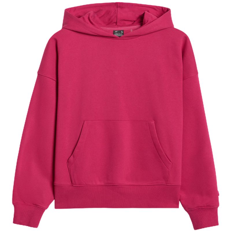 Women's sweatshirt 4F F1887 dark pink 4FWAW25TSWSF1887 53S Women's sweatshirt is perfect for everyday wear. Technical data: Main material: 80% cotton, 20% polyester Additional material: 100% cotton Additional material 2: 95% cotton, 5% elastane Weight: 350 gsm - thick, durable material ensuring thermal comfort One-sided brushed interior - provides additional warmth and softness from the inside Standard cut - comfortably fits the figure Standard cut reaching to the hips - classic length ensuring a universal fit Made mostly of cotton - soft, durable and pleasant to the touch Addition of polyester - increases the strength of the material and resistance to wear Solid colors - a universal base for various styles Single jersey knit - smooth, soft-to-touch surface Neckline with integrated hood - additional protection and a casual look Ribbed cuffs - stable sleeve finishing Unfastened kangaroo pocket on the front - a convenient place for hands and small items Dropped sleeves - do not restrict movement and emphasize the casual character. Drawstring bottom - ensures a good fit to the figure.