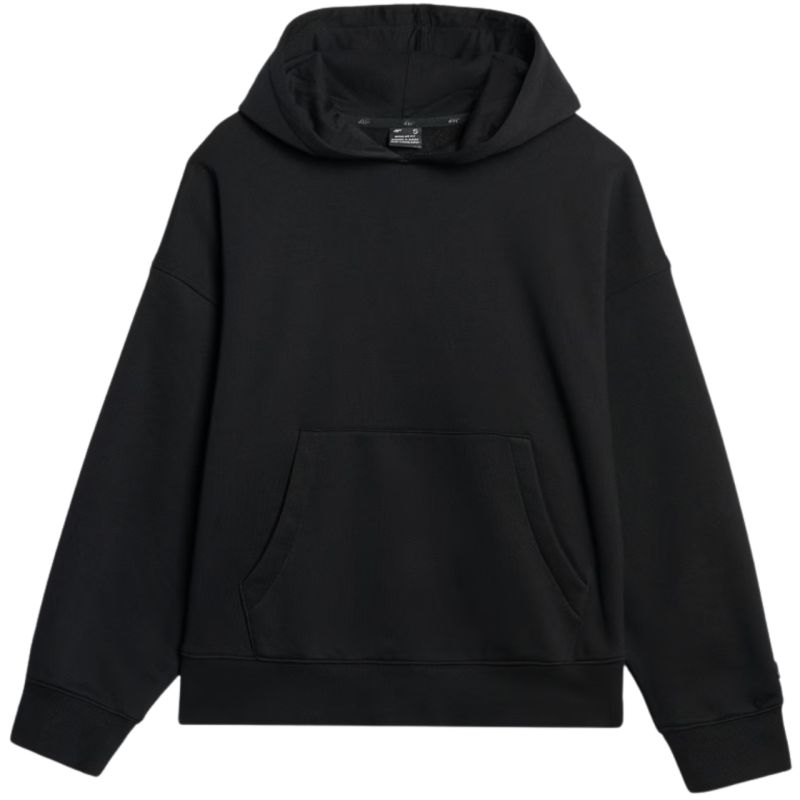 Women's sweatshirt 4F F1887 deep black 4FWAW25TSWSF1887 20S Women's sweatshirt is perfect for everyday wear. Technical data: Main material: 80% cotton, 20% polyester Additional material: 100% cotton Additional material 2: 95% cotton, 5% elastane Weight: 350 gsm - thick, durable material ensuring thermal comfort One-sided brushed interior - provides additional warmth and softness from the inside Standard cut - comfortably fits the figure Standard cut reaching to the hips - classic length ensuring a universal fit Made mostly of cotton - soft, durable and pleasant to the touch Addition of polyester - increases the strength of the material and resistance to wear Solid colors - a universal base for various styles Single jersey knit - smooth, soft-to-touch surface Neckline with integrated hood - additional protection and a casual look Ribbed cuffs - stable sleeve finishing Unfastened kangaroo pocket on the front - a convenient place for hands and small items Dropped sleeves - do not restrict movement and emphasize the casual character. Drawstring bottom - ensures a good fit to the figure.
