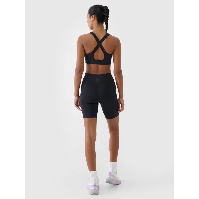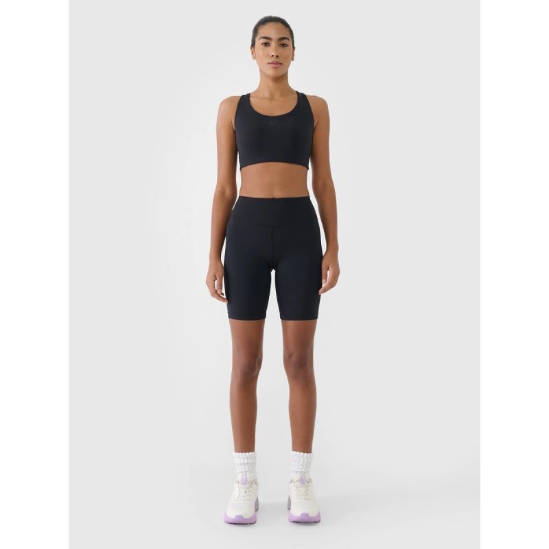 These women's 4F training cycling tights are designed for complete freedom of movement, comfort, and dynamic activity. The slim fit perfectly adapts to the body, while the mid-rise waistband holds the tights in place for enhanced coverage during exercise. Soft, durable interlock fabric ensures stretch and comfort, while quick-drying 4FDry technology helps wick moisture away from the body. Made from 82% recycled polyester and 18% elastane , they're not only comfortable but also a conscious choice for the environment. The above-the-knee cut provides full mobility, and a hidden pocket at the waistband provides storage for small accessories. This is the perfect style for gym workouts, fitness classes, group classes, or intense outdoor activities.