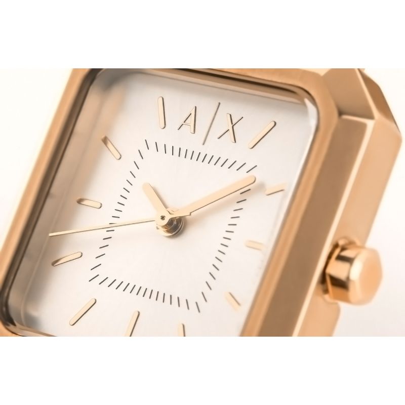 Discover how a rose gold-tone segmented watch bracelet can add charm to your everyday looks! Its subtle design exudes elegance, introducing a touch of finesse that draws attention. Crafted from high-quality stainless steel, it not only impresses with its appearance but also ensures durability and comfort. The sensual nature of this bracelet allows it to fit perfectly on a woman's wrist, delicately enveloping it and emphasizing its femininity. The subtle AX Armani Exchange logo on the bracelet clasp adds an exclusive touch.