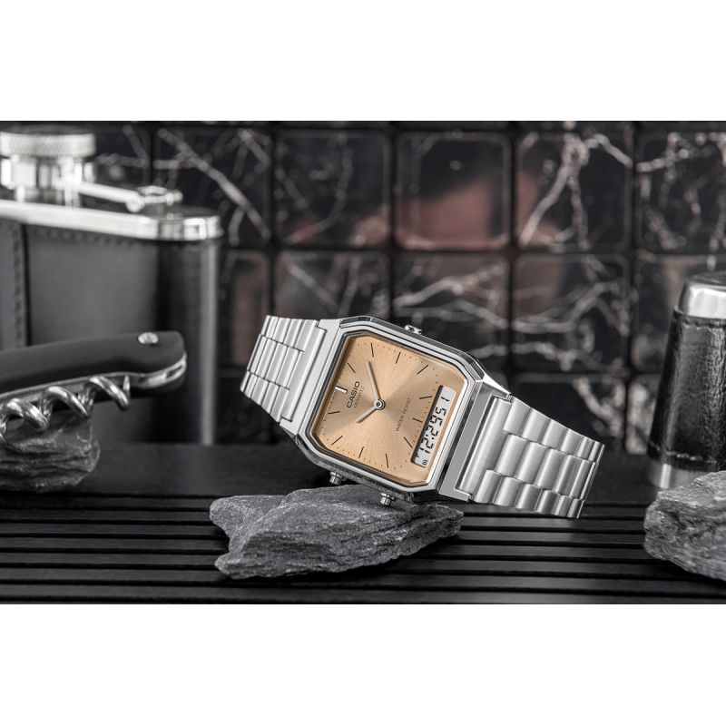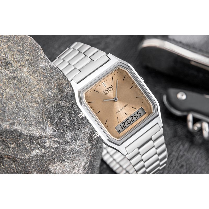 Charmingly classic, fashionably colorful – the iconic CASIO watch in a refreshed palette reflecting the latest color trends! Retro simplicity meets modern functionality in this analog watch with a small digital window that provides quick access to key information. The watch allows you to track two time zones, and features like a stopwatch, alarm, and automatic calendar make this watch perfectly suited to the rhythm of modern life. The versatile, elegant design makes it a perfect fit for both formal events and everyday outings. An ideal choice for those who appreciate vintage style but don't want to compromise on modern features.