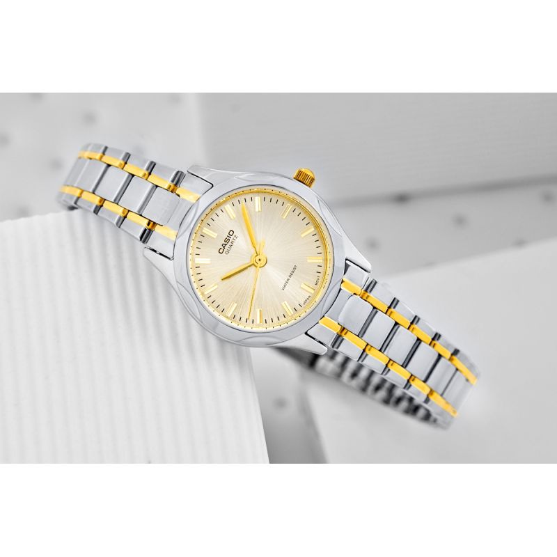 This CASIO watch is the perfect choice for women with petite, delicate hands, subtly accentuating their slenderness and elegance. Thanks to its compact case and lightweight construction, it wears almost like jewelry – comfortable, stylish, and incredibly timeless. It makes a perfect gift for First Communion – its classic design makes it suitable for both a young lady and a woman who appreciates subtle elegance. The silver and gold finish adds a unique and luxurious touch to the watch.