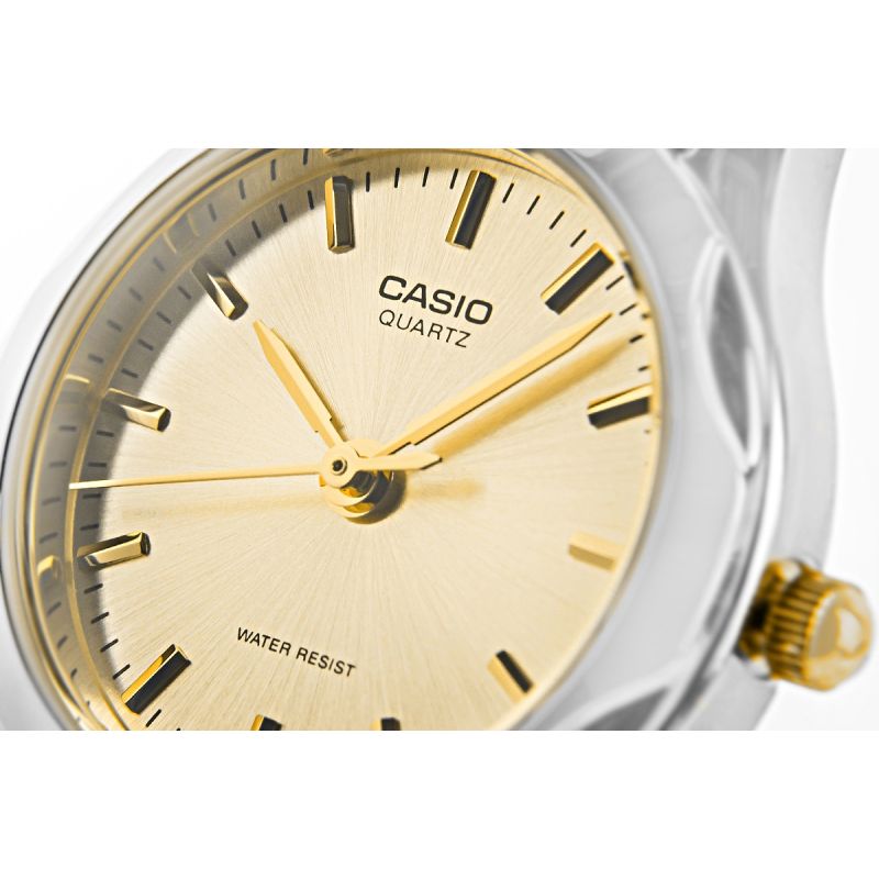 The bracelet is crafted from shiny silver-tone stainless steel with gold accents, subtly enhancing the watch's luxurious appearance. The contrast between the cool luster of silver and the warm sheen of gold gives this model an exceptionally chic and timeless look. It's the perfect solution for women who value versatile jewelry while also wanting to add a touch of luxury to their look. A subtle CASIO logo on the bracelet clasp completes the look.