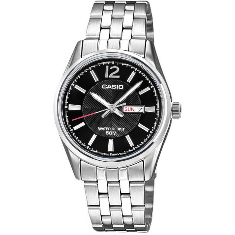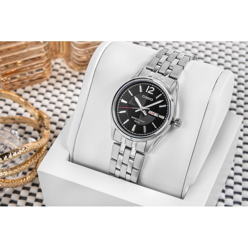 The CASIO LTP-1335D-1AVDF women's watch is the essence of timeless style in a modern setting – with a deep black dial that captivates the eye with its calm, simplicity, and expressive power. The minimalist, dark dial creates a beautiful contrast with the silver bracelet with a shimmering finish , wrapping the wrist like a subtle piece of jewelry. This is a classic that needs no embellishment – just one detail is enough to express everything. A discreet date function with the day of the week at 3 o'clock takes care of your daily rhythm, while water resistance to 50 meters gives you freedom – regardless of the weather or your schedule. This watch is subtle, yet decisive. It will look great with a white shirt, a black blazer, a light dress, or jeans – because you are its complement.