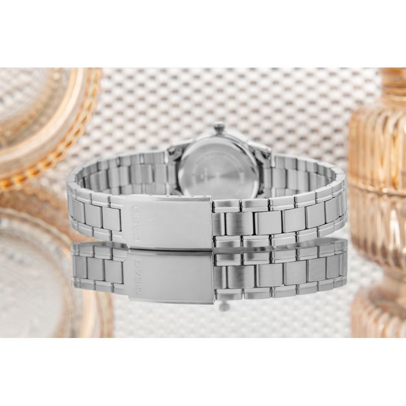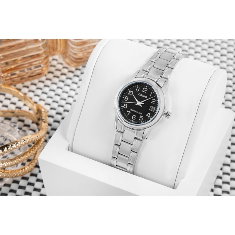 The CASIO LTP-V002D is a watch for women who value classic form and reliability. Its black dial with clear Arabic numerals and subtle hands ensures excellent readability, while the compact stainless steel case and bracelet create an elegant, versatile look – perfect for both the office and everyday wear. Water resistance for everyday use and a practical date display make it not only beautiful but also a practical everyday companion. Choose the CASIO LTP-V002D and choose understated elegance that never goes out of style.