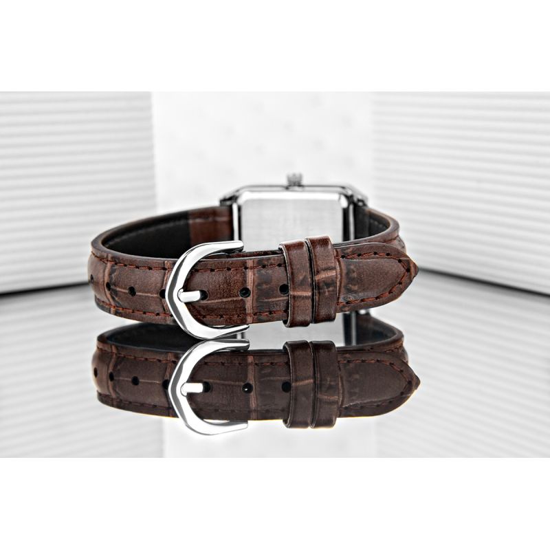 The clean, minimalist white dial contrasts with delicate black indices, lending clarity and harmony to the overall design. Every element has been crafted with understated luxury in mind – from the slim black indices to the delicately tapered hands, which measure time with remarkable precision. The geometric stainless steel case adds a modern touch, while its gently rounded edges create a light and harmonious overall appearance. This is not just a watch, it's a piece of jewelry that enhances your style – subtle yet confident, minimalistic yet unique. The embossed texture of the strap, inspired by genuine crocodile skin, adds a refined touch, while a subtle sheen enhances its luxurious appeal.