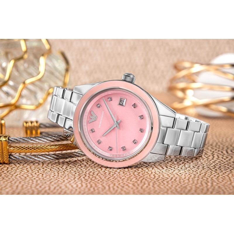 The Emporio Armani Leo AR11546 Women's Watch is a fusion of modern elegance and feminine charm. Designed with attention to every detail, it captivates with its subtle pink dial adorned with delicate crystals that beautifully reflect light. The 36 mm case is crafted from high-quality stainless steel, making the watch durable and resistant to everyday wear. The silver bracelet perfectly complements the dial color, creating a harmonious and stylish look. A precise quartz movement guarantees reliable operation, while 5 ATM water resistance protects the watch from splashes and brief contact with water. The Emporio Armani Leo AR11546 is the perfect choice for women who value elegance, functionality, and timeless style. It's not just a watch, but a piece of jewelry that will enhance any outfit and add a luxurious touch.