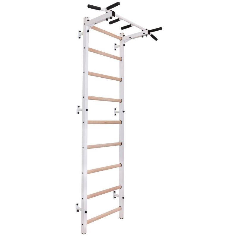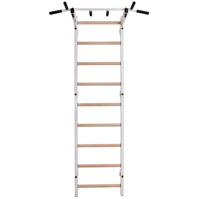 This gymnastics ladder is a model that perfectly complements Scandinavian-style interiors. The vertical profiles (40mm x 50mm) are made of high-quality, powder-coated metal. The rungs are made of oval-shaped beech, and their surface is hand-oiled, making the ladder comfortable to use. At the top of the ladder is a permanently mounted metal pull-up bar, equipped with six different handles that allow you to develop arm and back strength using various grips, such as a wide grip. The pull-up bar is 115 cm long.