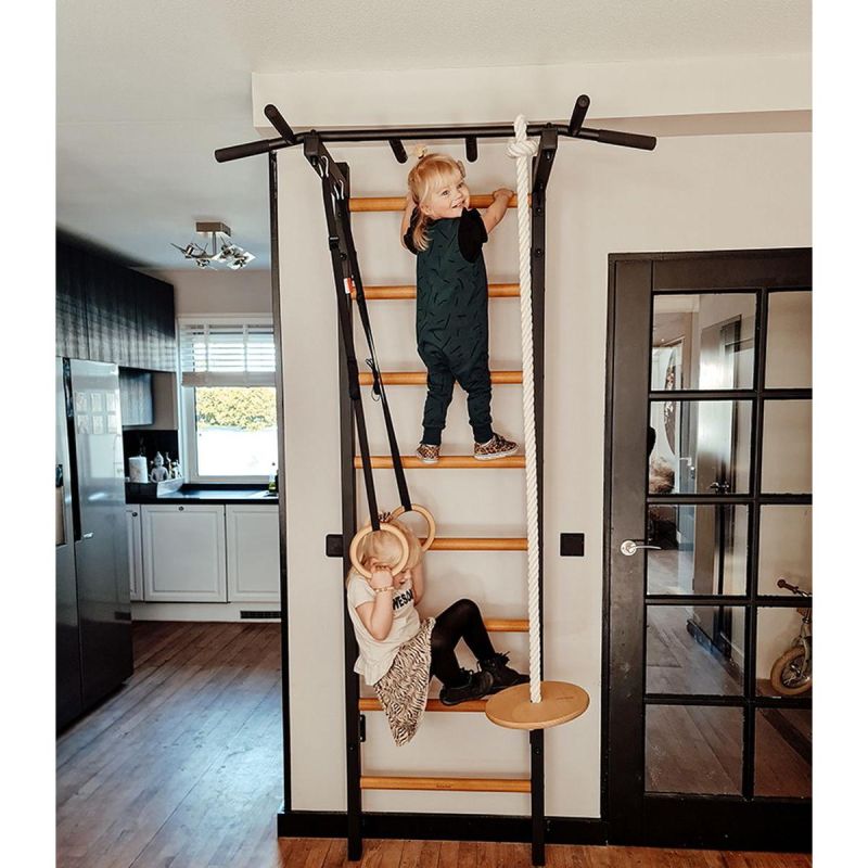 The set consists of a ladder, a permanently mounted metal pull-up bar, gymnastic rings, and a climbing rope with a plate. It can successfully replace a climbing wall, being much more versatile than it. The maximum user weight of the BenchK 222B ladder is 150 kg, making it suitable for practically every family member.