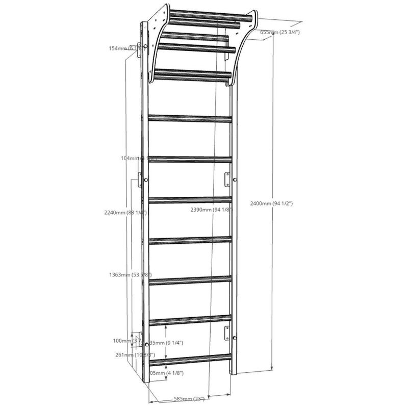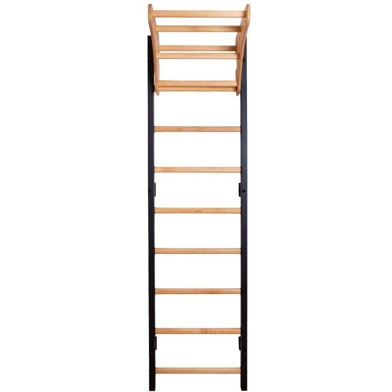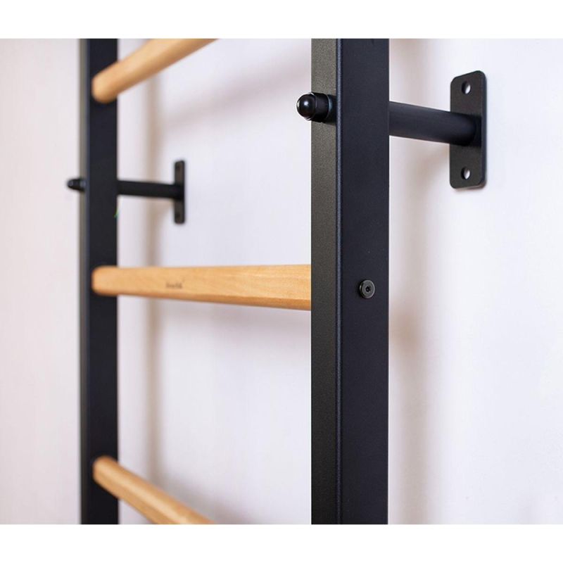 The BenchK 310B gymnastics ladder with a wooden bar is an extended version of the BenchK 310B/710B. The vertical profiles (40mm x 50mm) are made of high-quality metal with a matte black/matte white powder-coated finish. The oval rungs are made of solid beech. Their surface is hand-oiled with two layers of organic German linseed oil, which is food-safe.
