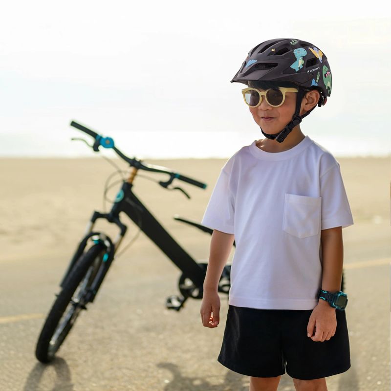 The color scheme and modern design make the helmet visually appealing and emphasize the individual style of the young cyclist, encouraging constant wearing in various riding conditions.