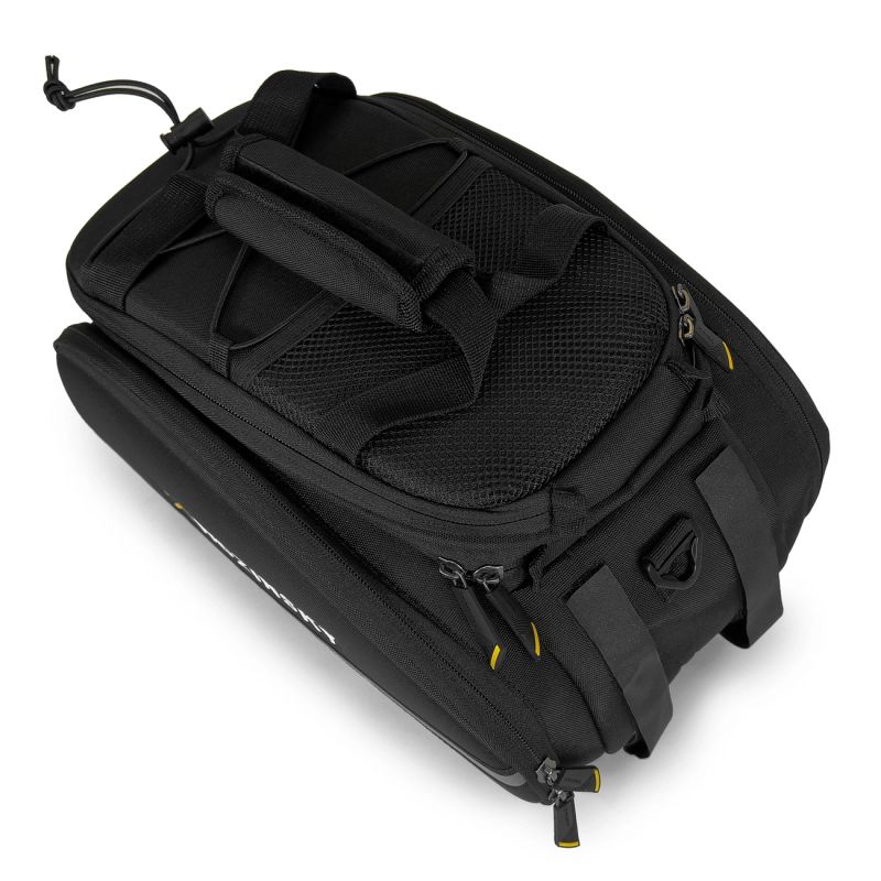 The Wozinsky WBB19BK gives you three transport options: on a bike rack, in your hand, or over your shoulder . The bag is equipped with two wide Velcro straps , a long shoulder strap , and a comfortable handle .