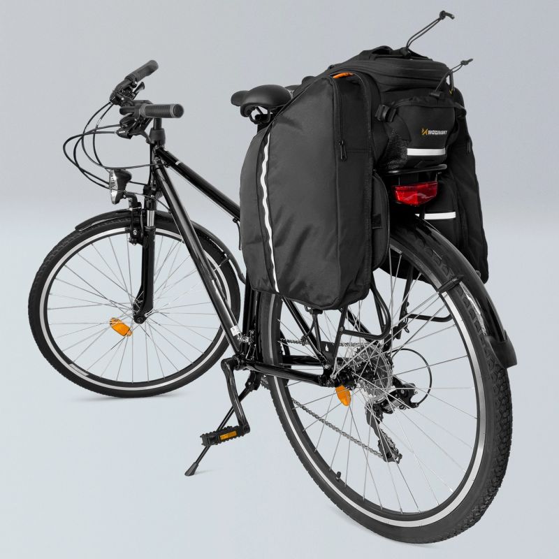 The Wozinsky WBB19BK bike rack bag is one of the most functional bags in our range . It boasts many practical features: large, extendable panniers, a rain cover, convenient internal compartments, and a shoulder strap . Depending on your needs, you can quickly and conveniently expand its usable space. It's a great accessory for both short and long trips . The bike rack bag is also easy to install and remove , making it easy to take with you.