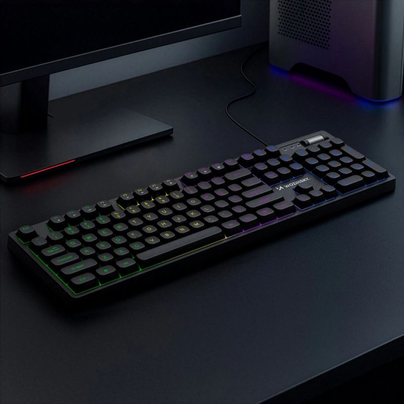Elevate your gaming experience with the Wozinsky WKG-200 membrane keyboard! This robust, full-size keyboard features multimedia functionality and striking, rainbow RGB backlighting. Its distinguishing feature is a convenient volume control wheel – perfect for quick sound adjustments during gameplay or work. Multimedia functions are accessible via the FN+F1 to FN+F12 shortcuts, allowing you to manage your music, browser, or computer without leaving your game. A key lifespan of up to 10 million keystrokes and an ergonomic layout ensure long-lasting comfort. Furthermore, the ability to turn off the backlight by pressing the wheel allows you to adapt the keyboard to any scenario – from late-night gaming to focused office work. Choose durability, style, and functionality in one device!