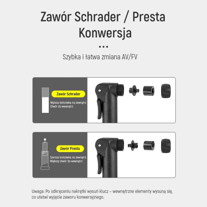 The Wozinsky WPR-01 is a compact bicycle pump designed for portability and reliability on the road. It accepts Presta and Schrader valves, allowing for universal use. A maximum pressure of 5.5 bar allows for fast inflation, while a nozzle lock ensures safety. Its compact size allows it to easily fit in a bag or backpack.