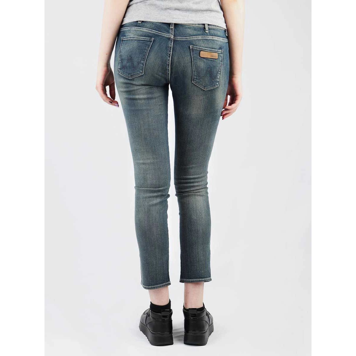 Women's Wrangler jeans with a regular waist and tapered legs. They fasten with a zipper and a metal logo button. Made of 98% cotton and 2% elastane, they offer a slight stretch with added stretch. A leather patch with an embossed brand logo is featured on the back pocket.