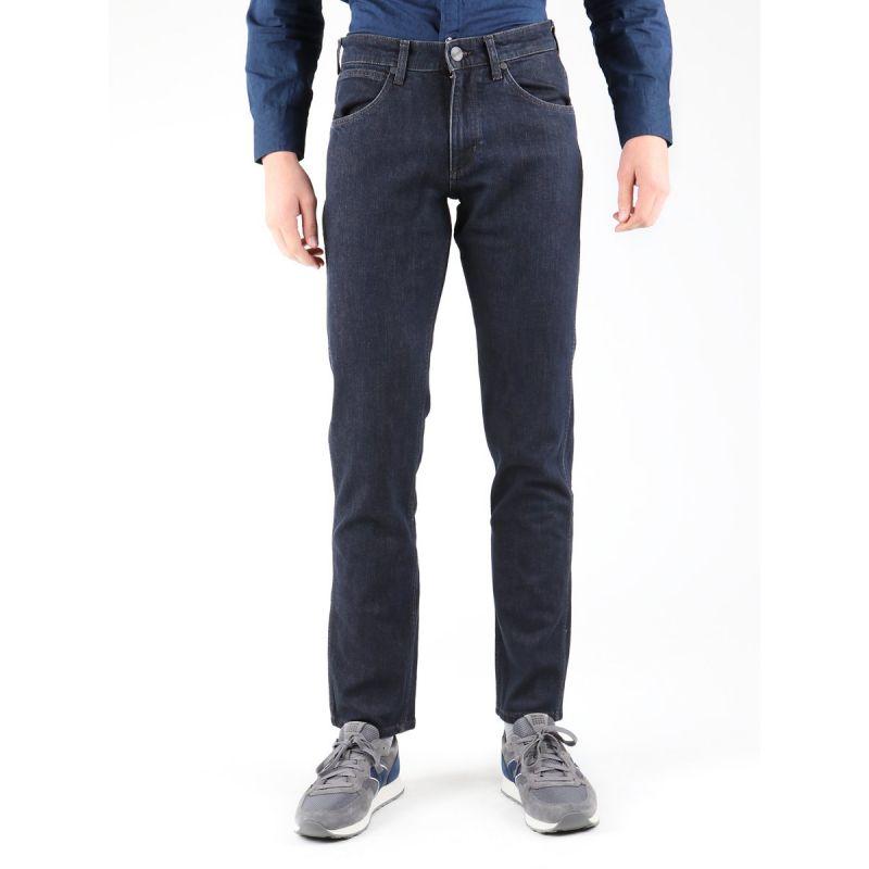 Men's straight-leg jeans. Mid-rise. Large pockets in the front and smaller ones in the back. Leather insert with the Wrangler logo on the back pocket. Material: 82.5% cotton / 16.5% polyester / 1% elastane
