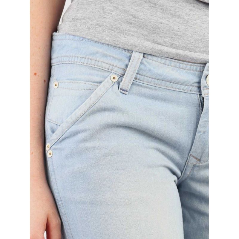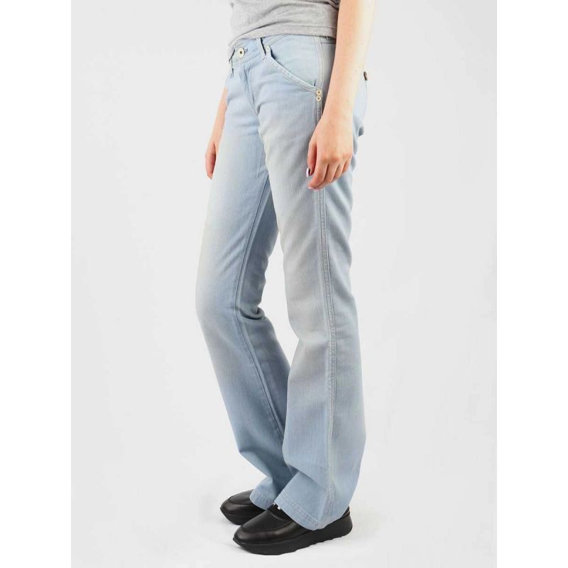 Women's low-rise, wide-leg jeans with a zipper closure. A white leather logo patch is featured on the back of the waistband.