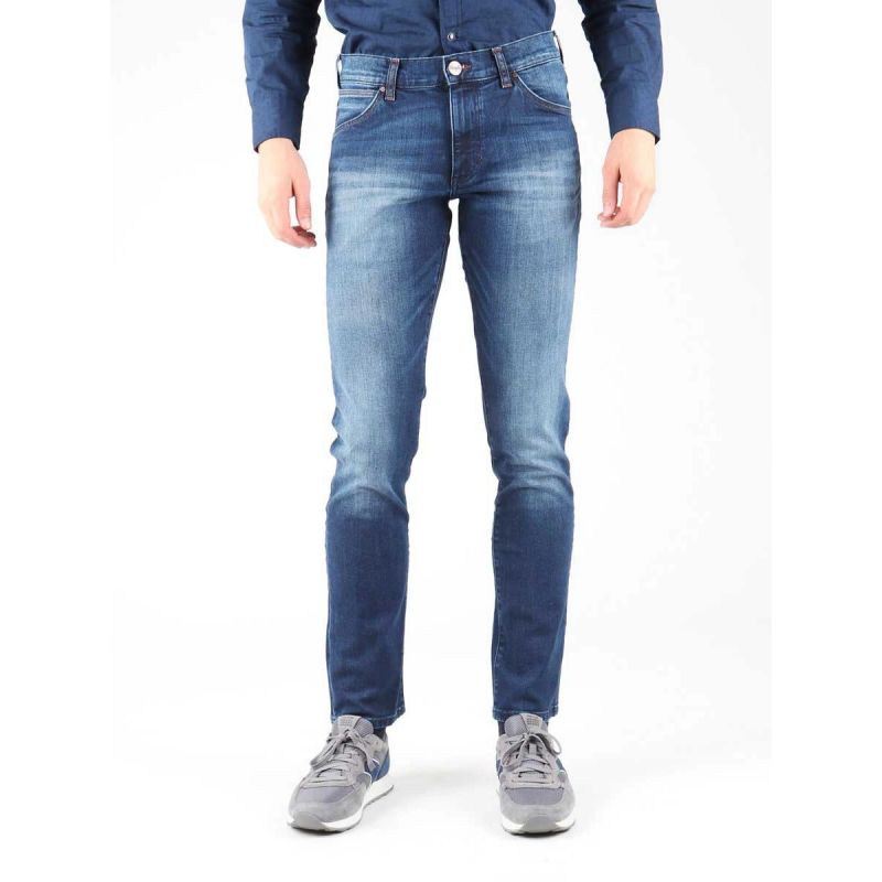 Men's straight-leg jeans. Regular fit. Large front pockets. Leather insert with Wrangler logo on the back waistband.