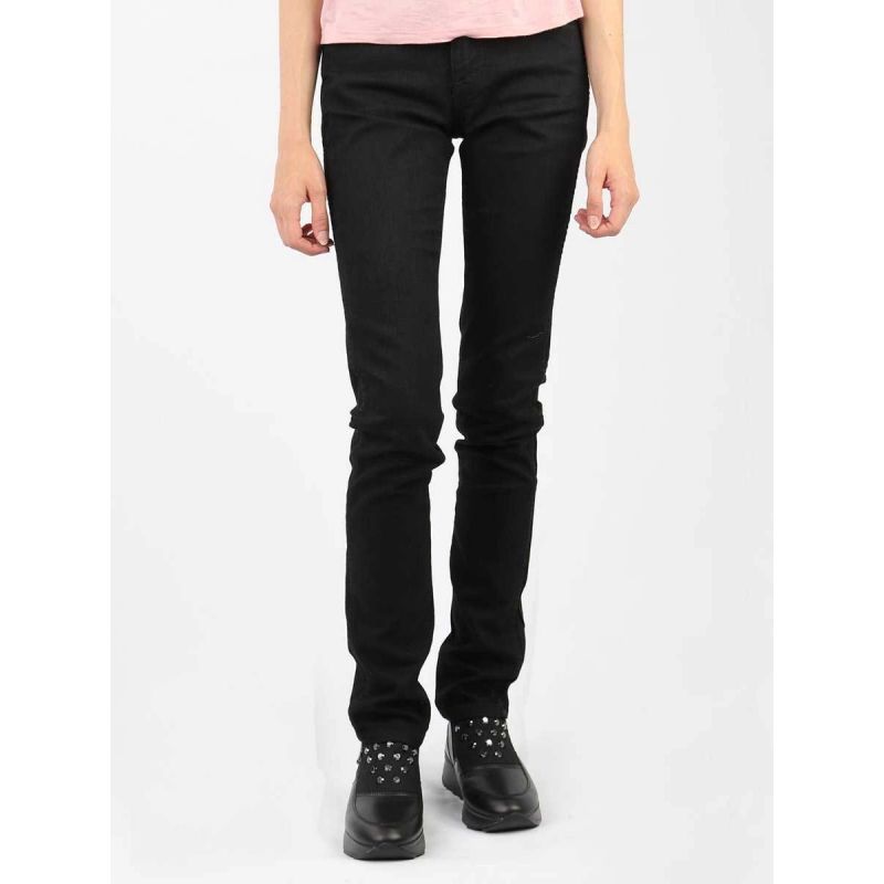 Women's black denim jeans. Low-rise waist and slim legs. Zipper closure. Brand logo patch on the back pocket.