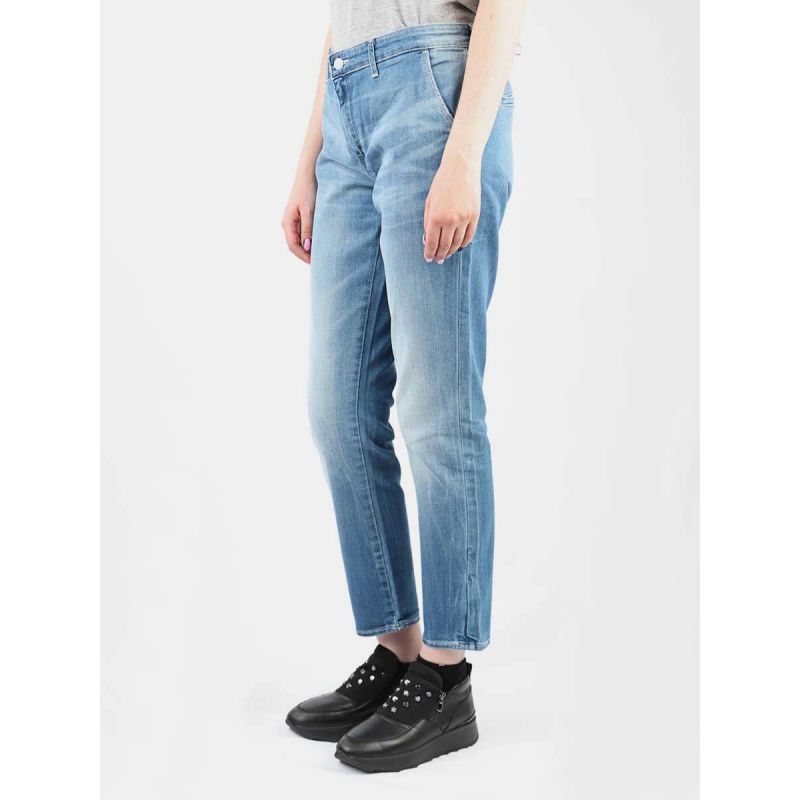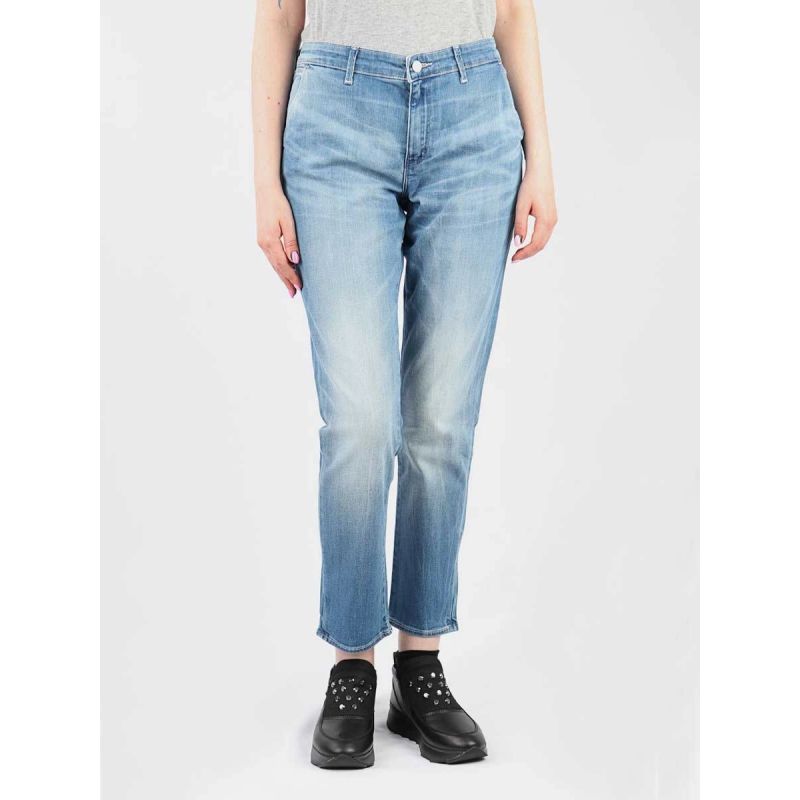 Women's high-waisted jeans with tapered legs. Zipper and button closure.