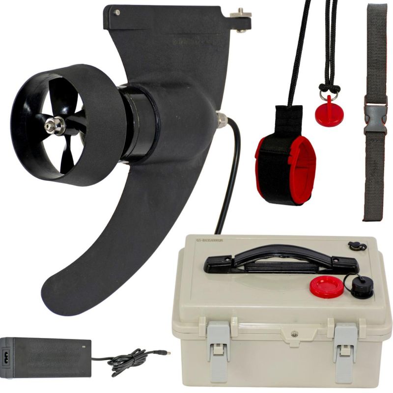 There's no need to buy any additional components – the box includes a motor with a fin, a 10AH battery, a charger, a mounting strap, an ankle leash with automatic stop, and a remote control. This complete setup means you can use the motor immediately. Simple assembly means installation takes just a few minutes.